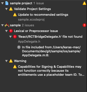 아래 같은 경우는 react native 프로젝트가 정상적으로 생성되지 않은 경우 입니다. cocoapod, jdk 등 설치가 정상적으로 되지 않은 경우 프로젝트 생성(react-native init <project name>) 할때 에러가 발생합니다. 그러면 빌드 시 아래와 같은 에러가 발생합니다. 그때는 프로젝트를 지우고 정상적으로 프로젝트를 다시 생성하세요