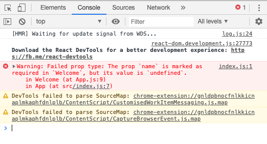 위의 예제와 비슷하게, 필수 props로 설정한 값에 값이 없다는 오류 메시지가 출력이 되는 것을 확인할 수 있습니다.