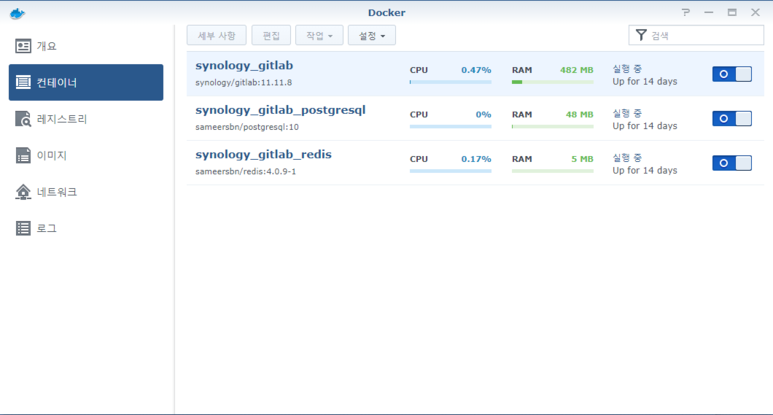 제가 사용하고 있는 시놀리지에 개인 소스 코드 형상관리 툴로 gitlab을 사용하고 있습니다.